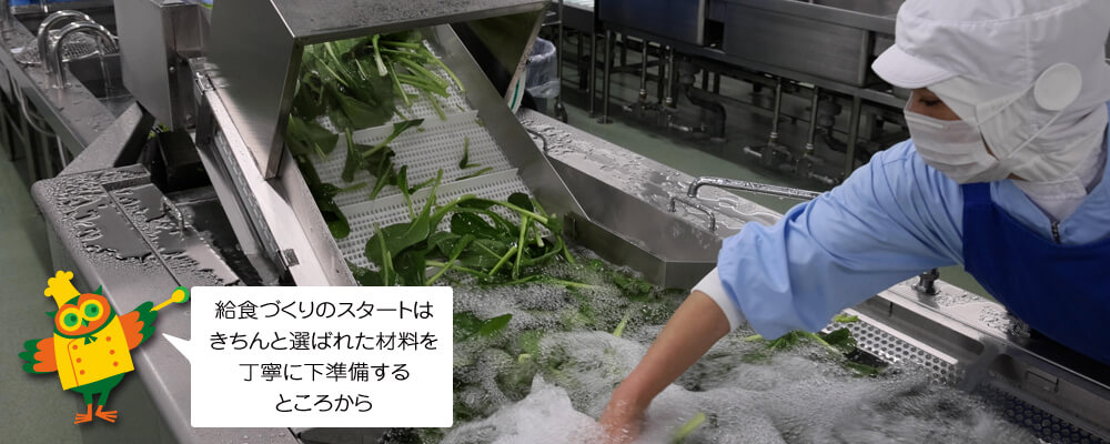 野菜類と肉類で分かれています。野菜類下処理室では、野菜洗浄機を使い、野菜、果物、加工食品の下準備を。野菜は三槽の水槽を使い、果物など生で食べるものは専用の水槽で洗浄・消毒します。肉魚下処理室では、下味をつけるなどの準備を行います。