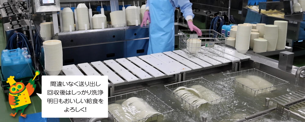 回収された食器や食缶コンテナは、汚染作業区域内の洗浄室へ。それぞれ専用の洗浄機で洗浄して、非汚染作業区域内のコンテナ室に運ばれるよ。